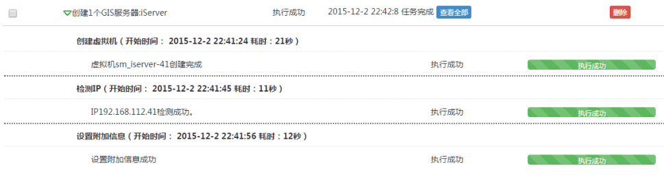 图标或是直接点击该任务,可以查看系统为完成该任务所做的操作,每步操作的开始时间和执行进度也会显示,任务执行过程中,会有任务进度条,且条上有进度的百分数;执行完成后,进度条上会显示执行成功,每个步骤后会有耗时时间。系统在创建 GIS 环境时,一般为“创建虚拟机”、“检测 IP” 和”设置附加信息“三步。