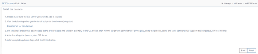 Click the “Next” button, enter the page for installing the Daemon page. Complete the progress according to the prompts and then click the “Finish” button to add the GIS server. On the list page of the GIS servers, you can see the GIS server you just added.