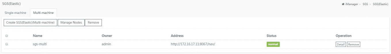 You can view the SGS that the current user has created, and the details of SGS, such as site name, address, state and operations on the SGS(Elastic)(Multi-machine) page.