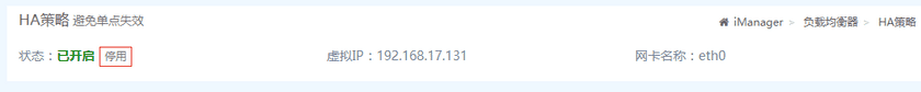 填写好以上信息后,点击“确定”,iManager将会根据您填写的信息自动启动HA策略。HA策略开启后,HA策略管理页面会显示HA策略的状态为“已开启”,并且将您配置的虚拟IP和网卡名称显示在页面上,如下图所示。