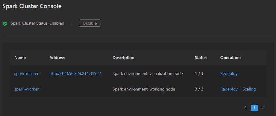 In the Spark Cluster page, all the added spark cluster environments are shown in the list, as the screenshow below.
