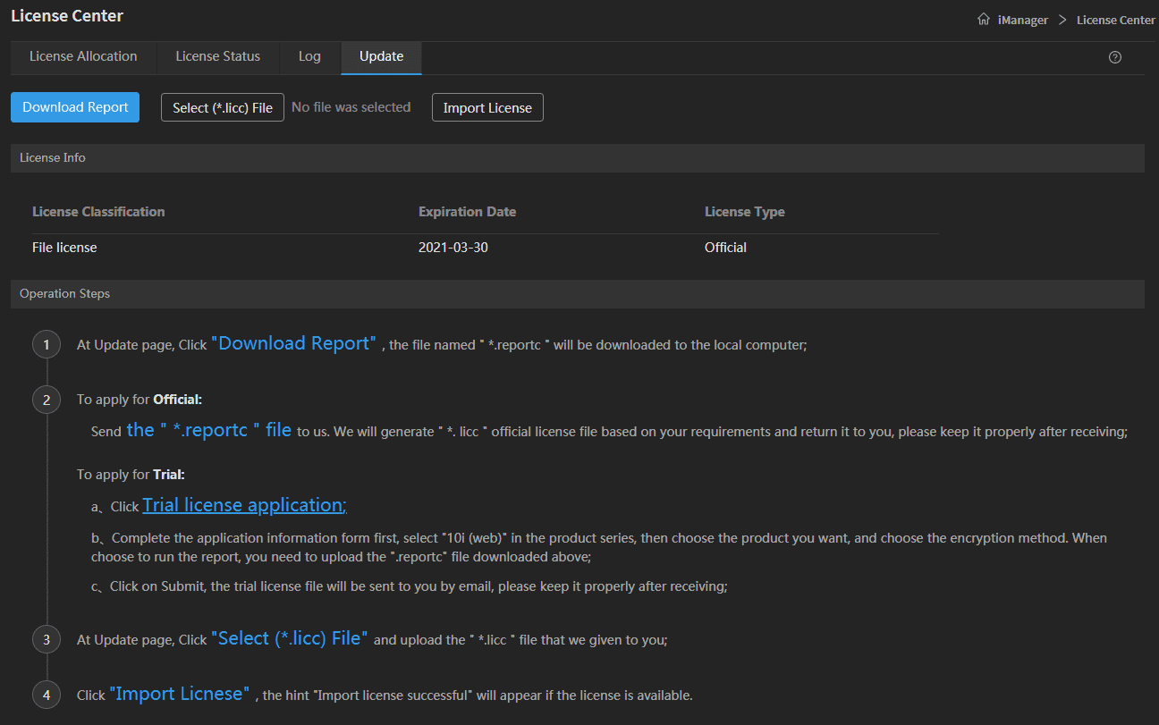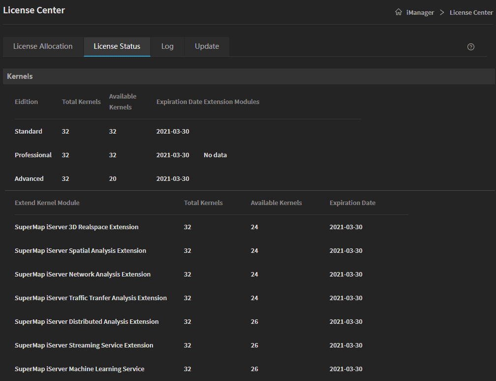 Visit the SuperMap License Center UI, click on Update on the License Center page, and follow the Operation Steps to activate the license (If you do not have the license, please apply the trial license on SuperMap official website).