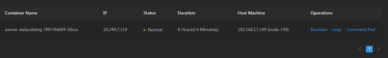 Clicks on the name of Data Catalog Service to enter the container page, the page lists the information of container name, IP, status, duration, and host machine. If the container malfunctioned, you can recreate the container, the service would stop working until finishing recreating.