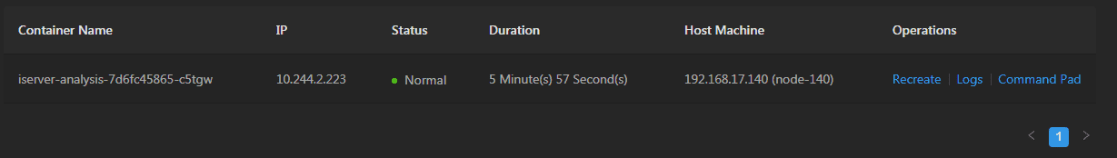Clicks on the name of Distributed Analyst Service to enter the container page, the page lists the information of container name, IP, status, duration, and host machine. If the container malfunctioned, you can recreate the container, the service would stop working until finishing recreating.