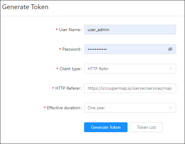 Token is a message string encrypted by shared key, it cantains user name, expiry date and certain proprietary information. SuperMap provides a user authentication mechanism based on Token, allowing users to access the protected service resources by only providing Token, without providing a username and password. Please follow the steps below to generate Token: