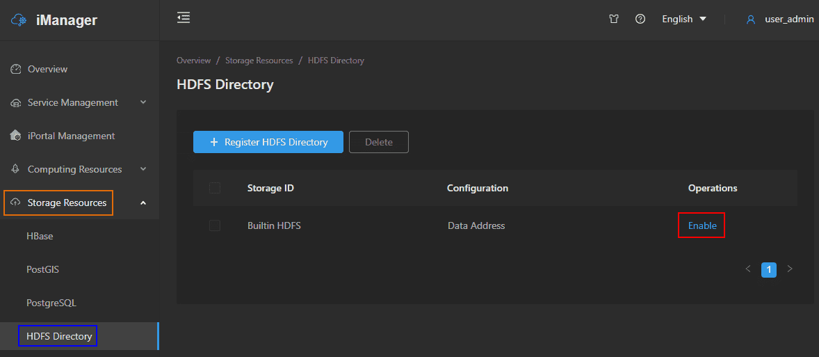 GIS Cloud Suite supports to register internal and external HDFS Directory. The internal one is the built-in HDFS Directory in GIS Cloud Suite. The external one is the HDFS Directory build by users, it is required to configure and register in GIS Cloud Suite. Please follow the steps below to register HDFS Directory.