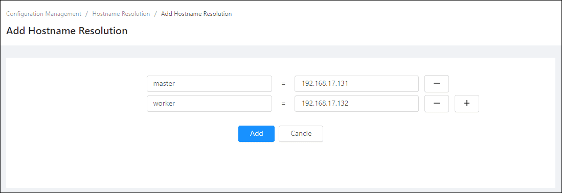 On the left navigation bar, clicks on Configuration Management > Hostname Resolution > Add.