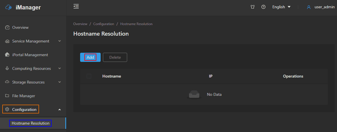 The purpose of adding Hostname Resolution is for communication and identification between GIS Cloud Suite and external HBase/Hadoop YARN environmrnts, users need to add the hostname and IP address of the master nodes and worker nodes. There are a few of situations need to add Hostname Resolution, when publishing HBase service, registering HBase service, and adding Hadoop YARN cluster. Please add Hostname Resolution by the following steps: