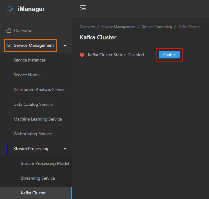GIS Cloud Suite supports to manage built-in Kafka Cluster, users can open built-in Kafka Cluster by clicking on Service Management > Stream Processing > Kafka Cluster > Enable.