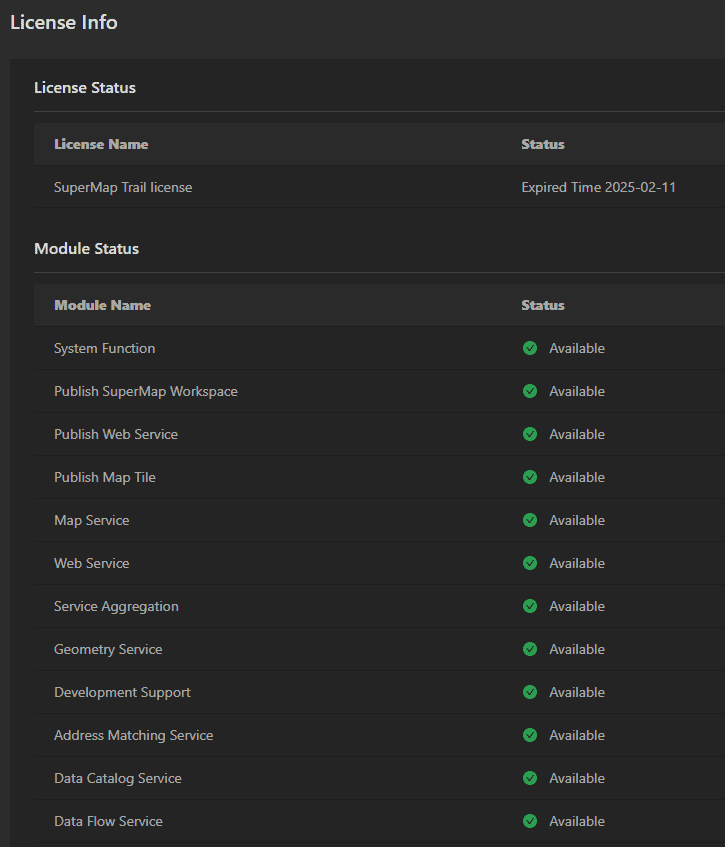 GIS Cloud SuiteLicense Info GIS Cloud Suite supports to view the license information. Users can view the license status and module status on the License Info page.