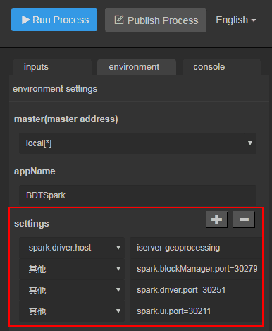 Port Info: The port information of computing resource. Fill the port information in environment > settings when using geoprocessing service. As the screen shot below, select sprk.driver.host and fill in ‘iserver-geoprocessing’ in the first row, select 其他 and fill in the port information in other three rows.