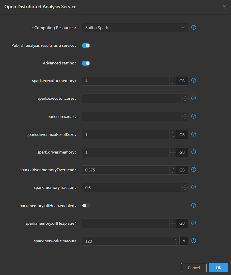 If you use built-in Spark, you can set the following parameters in Advanced setting:
