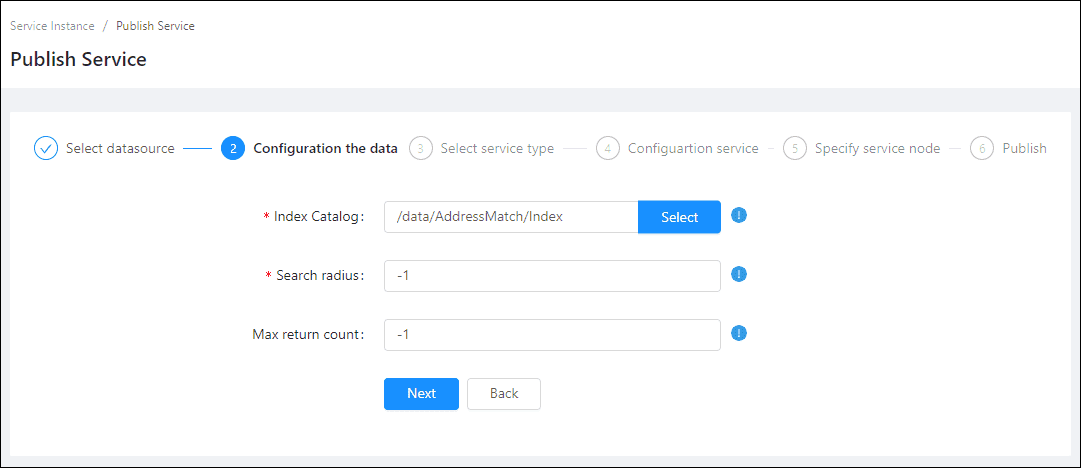 - Index Catalog(Required): This parameter is used to specify the output path of the generated address index file. During publishing, the sytem will build index according to the specified fields of the dataset being used, and segment words to them based on the input dictionary. You can also input an existing index file .