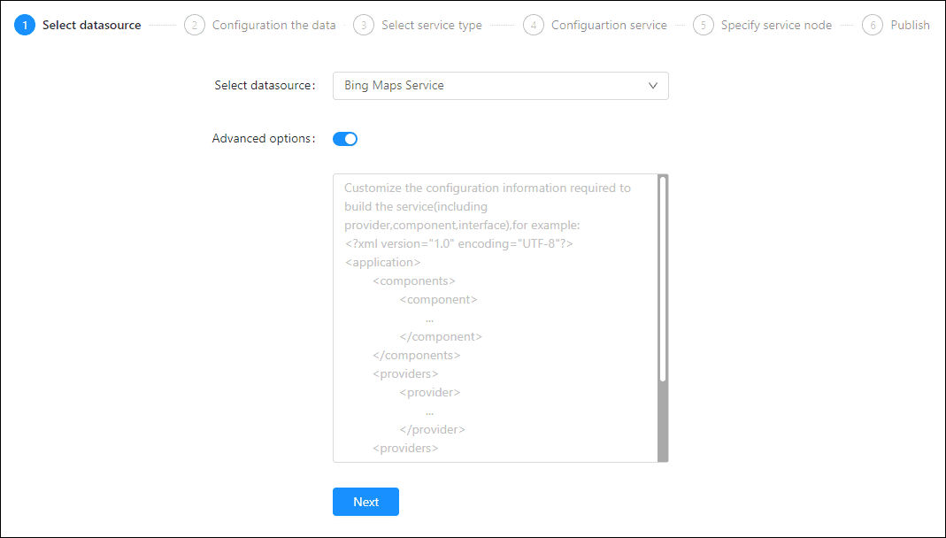 - Advanced Options(Used for customize configuration): Customize the required configuration information to build the service, such as provider, component, and interface. Please refer to SuperMap iServer Documentation for more introductions. Service extension please refer to GIS Cloud Suite Extension.