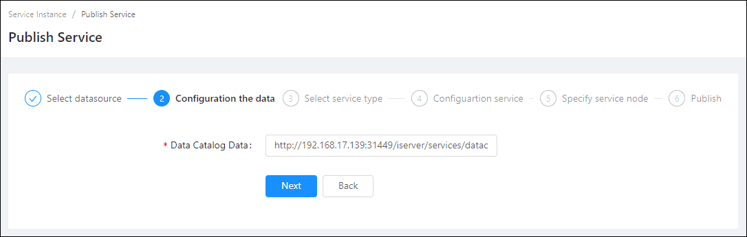 Log in to GIS Cloud Suite, clicks on iManager Home > System Management; clicks Service Management > Service Instances on the left navigation bar; clicks on + Publish Service on the page of Service Instances. Selects Data Catalog Service and clicks on Next.