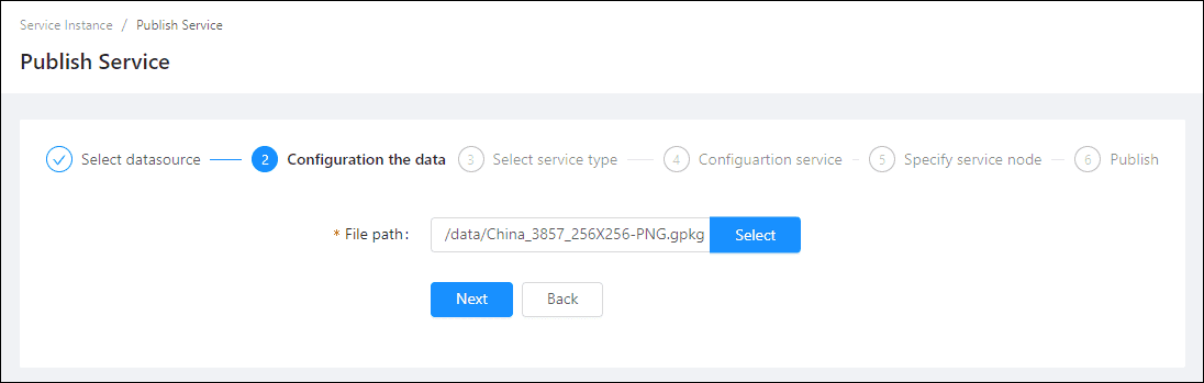 Log in to GIS Cloud Suite, clicks on iManager Home > System Management; clicks Service Management > Service Instances on the left navigation bar; clicks on + Publish Service on the page of Service Instances. Selects GeoPackage File and clicks on Next.