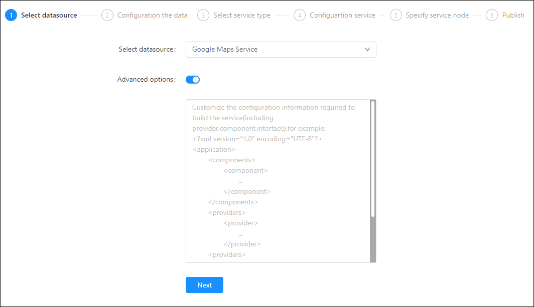 - Advanced Options(Used for customize configuration): Customize the configuration to build services, more details please refer to SuperMap iServer Documentation. To extent services please refer to Service Management > Service Extension. To migrate services from iServer please refer to Appendix > iServer Services Migration.