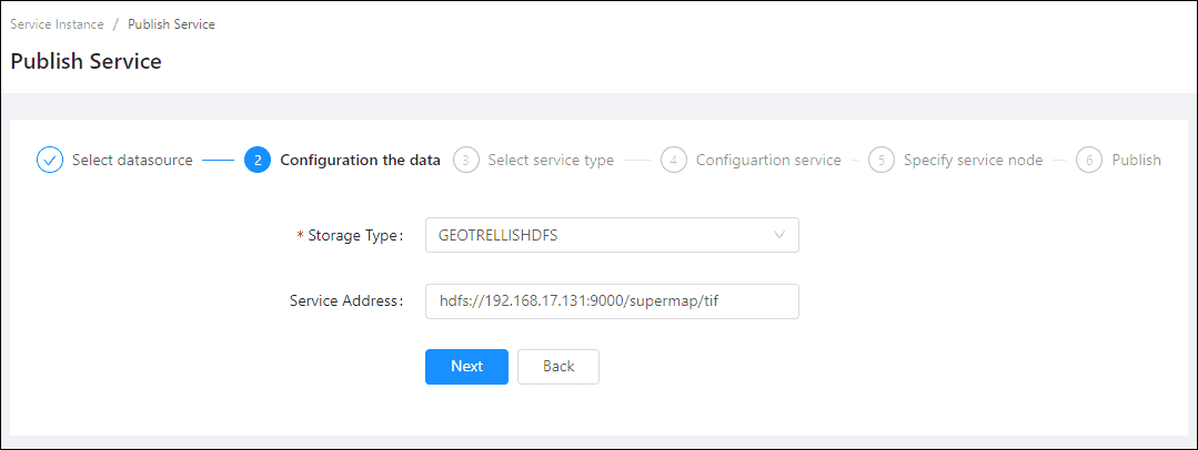 Fills out the datasource information. There are three kinds of storage types, they are HBase storage, Geotrellisfile storage, and GeotrellisHDFS storage.