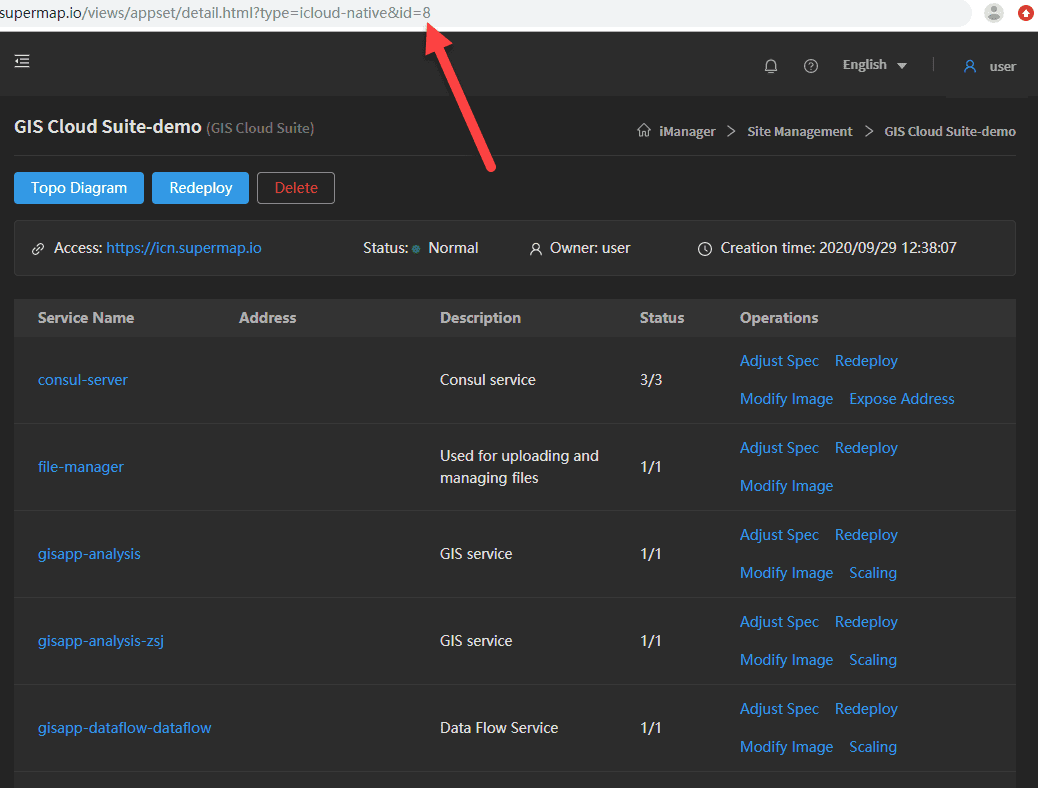- Create a GIS Cloud Suite site in SuperMap iManager. GIS Could Suite Creation please refer to Tutorial > Sites Management > GIS Cloud Suite > GIS Cloud Suite Creation.
