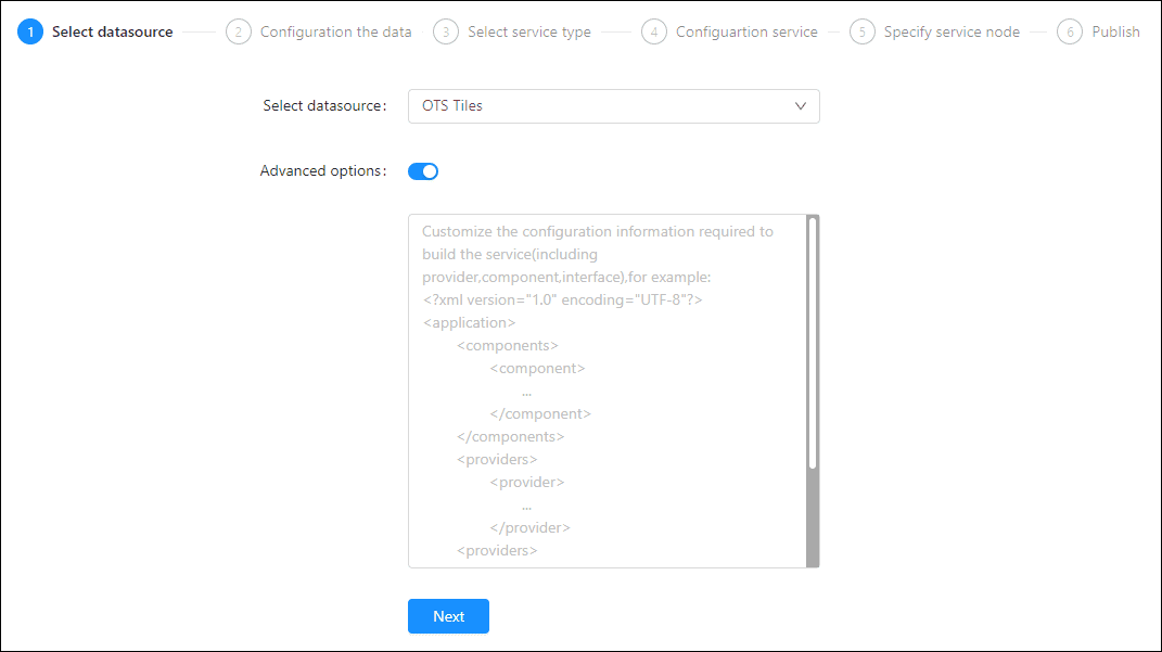 - Advanced Options(Used for customize configuration): Customize the configuration to build services, more details please refer to SuperMap iServer Documentation. To extent services please refer to Service Management > Service Extension. To migrate services from iServer please refer to Appendix > iServer Services Migration.