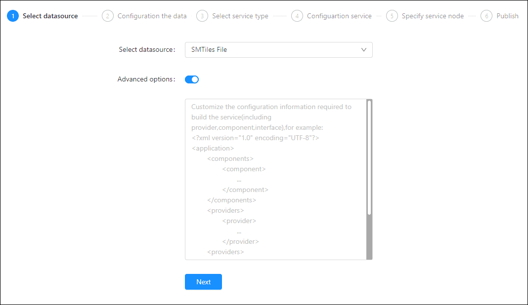 - Advanced Options(Used for customize configuration): Customize the configuration to build services, more details please refer to SuperMap iServer Documentation. To extent services please refer to Service Management > Service Extension. To migrate services from iServer please refer to Appendix > iServer Services Migration.