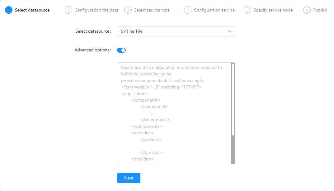 - Advanced Options(Used for customize configuration): Customize the configuration to build services, more details please refer to SuperMap iServer Documentation. To extent services please refer to Service Management > Service Extension. To migrate services from iServer please refer to Appendix > iServer Services Migration.