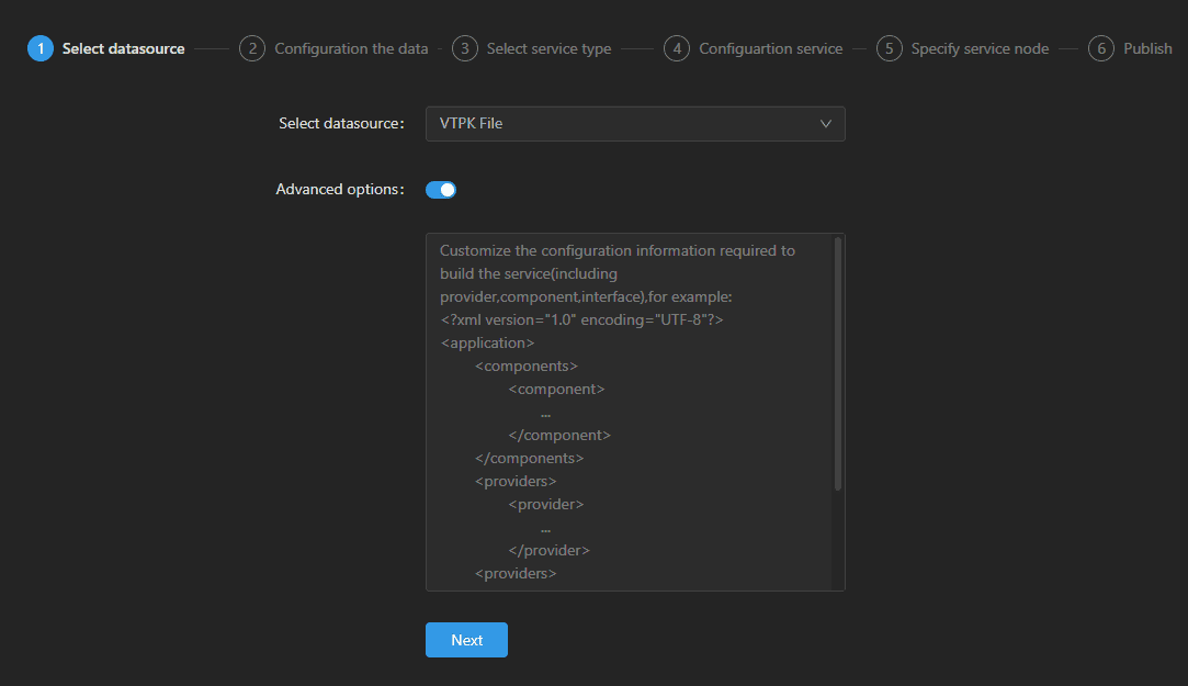 - Advanced Options(Used for customize configuration): Customize the configuration to build services, more details please refer to SuperMap iServer Documentation. To extent services please refer to Service Management > Service Extension. To migrate services from iServer please refer to Appendix > iServer Services Migration.