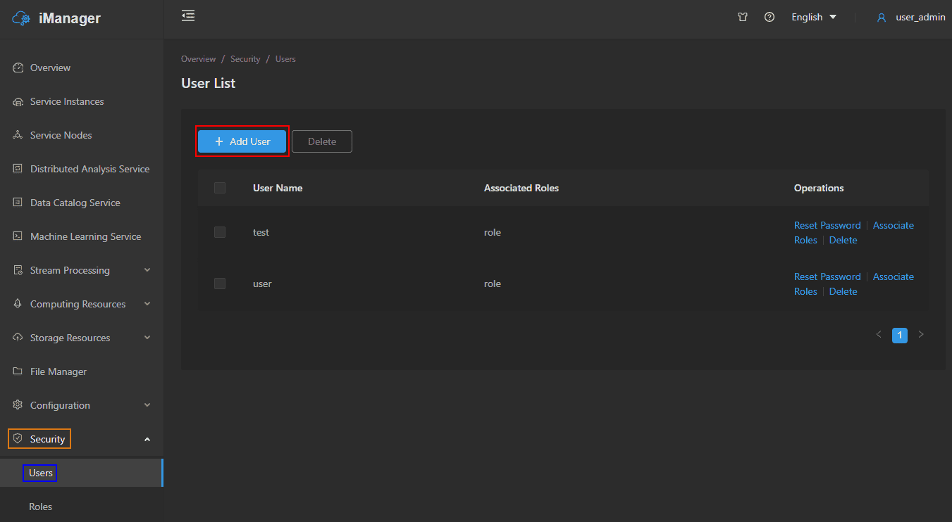 User is a person or program, it is used for visiting services and service management. On the Users page, the administrator can create new users, and associate roles to the users.