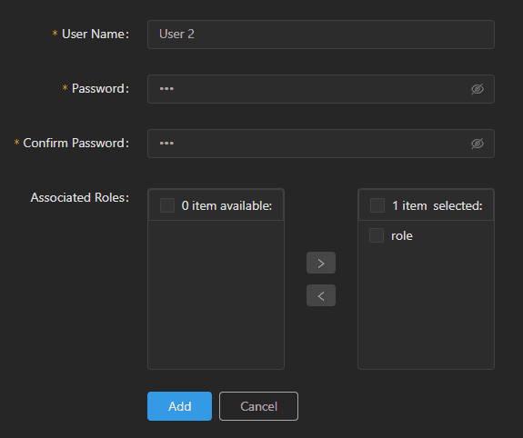 On the Users page, the list displays all the users, including administrator and normal users. The administrator can reset user’s password, modify the associated roles, and delete the users.