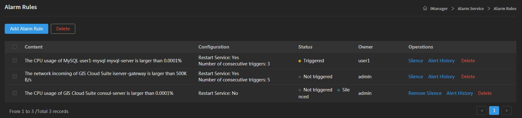 SuperMap iManager provides Alarm Rules management, supports to add new alarm rules and manage existing rules.