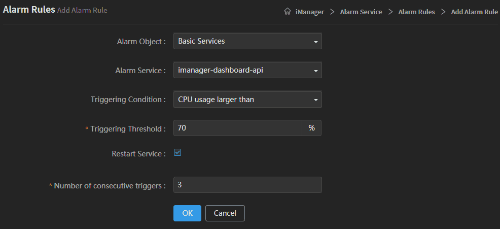 For example, as the screenshot above, the alarm object is ‘basic services’ environment, the alarm service is ‘imanager-dashboard-api’, the triggering condition is ‘CPU useage larger than’, the triggering threshold is ‘70%‘. When the CPU useage of imanager-dashboard-api is larger than 70%, the system will alarm automatically. If the service trigger the alarm rule 3 times in a row, the service ‘imanager-dashboard-api’ will restart automatically.
