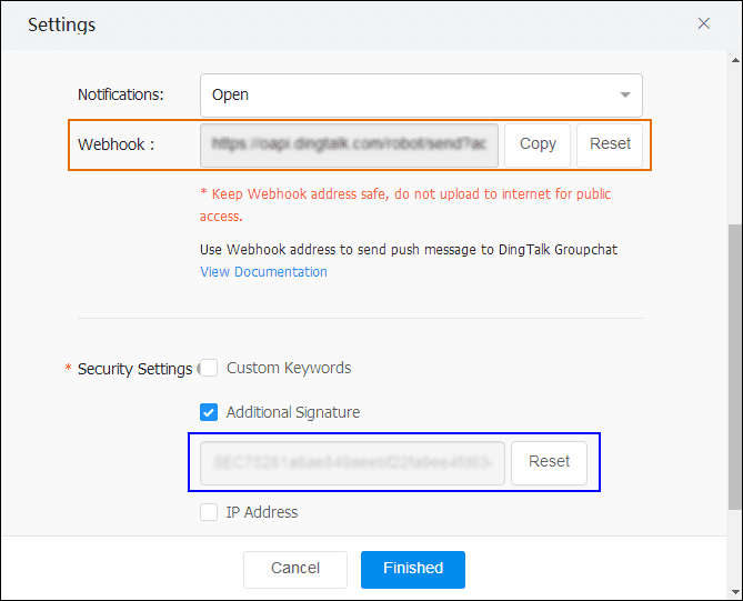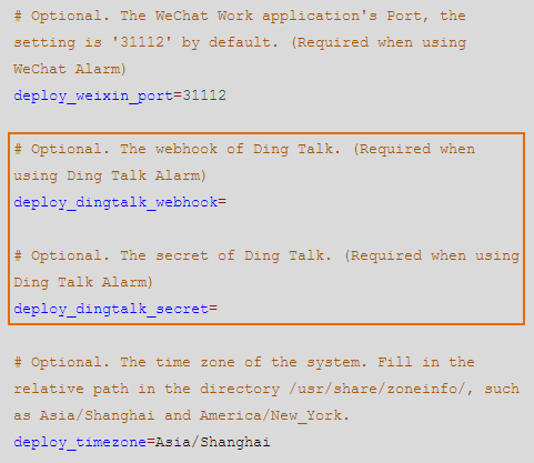 Add the values of ‘Webhook’ and ‘Additional Signature’ to ‘deploy_dingtalk_webhook’ and ‘deploy_dingtalk_secret’ separately.