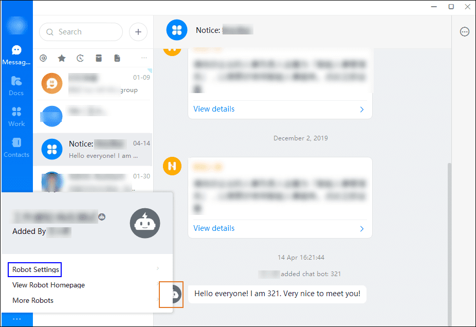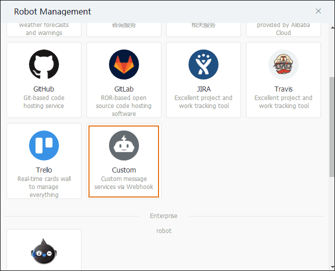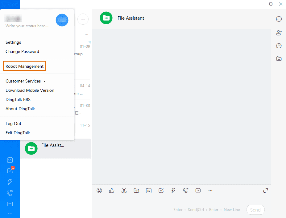 Clicks the name on the top left of Ding Talk, select Robot Management.