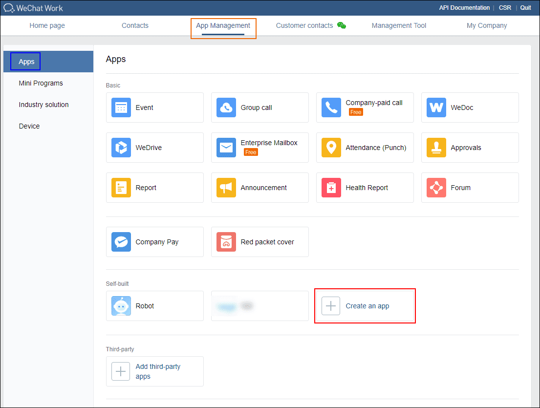 Login to the home page of WeChat Work after registering(Please login by web page), click on App Management > Apps > Create an app.