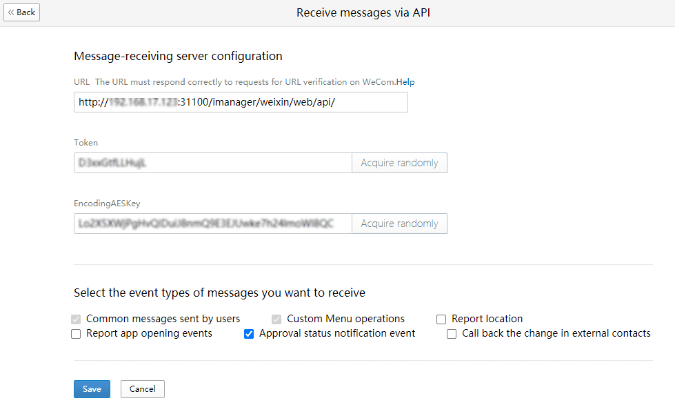 - Fill in the Token and EncodingAESKey, you can define the settings, or acquire randomly.