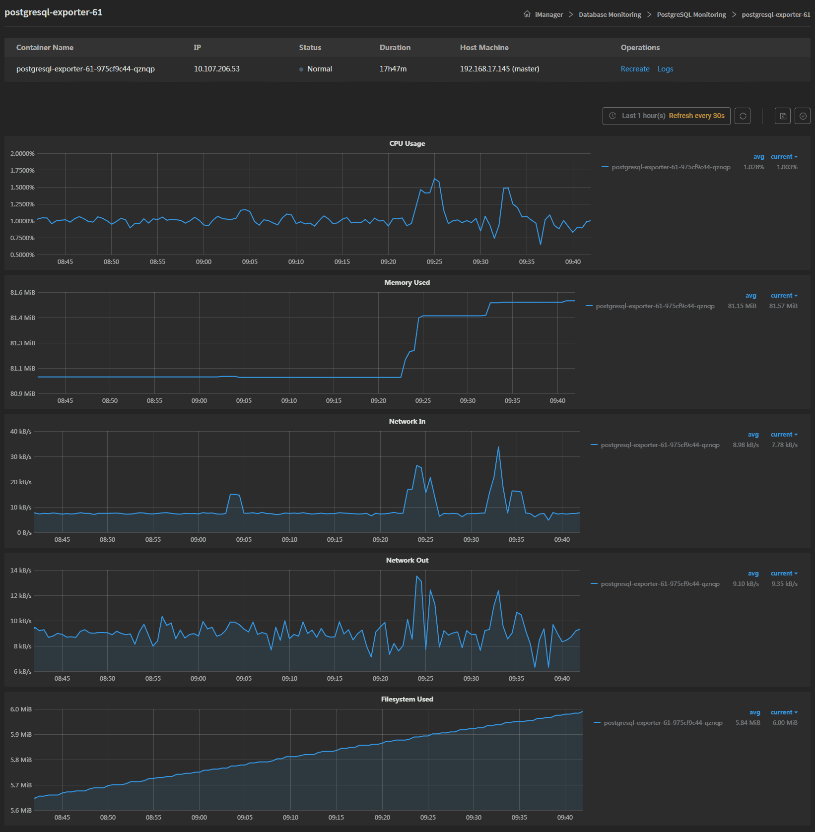 On the bottom of the page, the monitoring panels record the real-time indicators of CPU useage, memory useage, network in/out, and filesystem useage of the exporter.