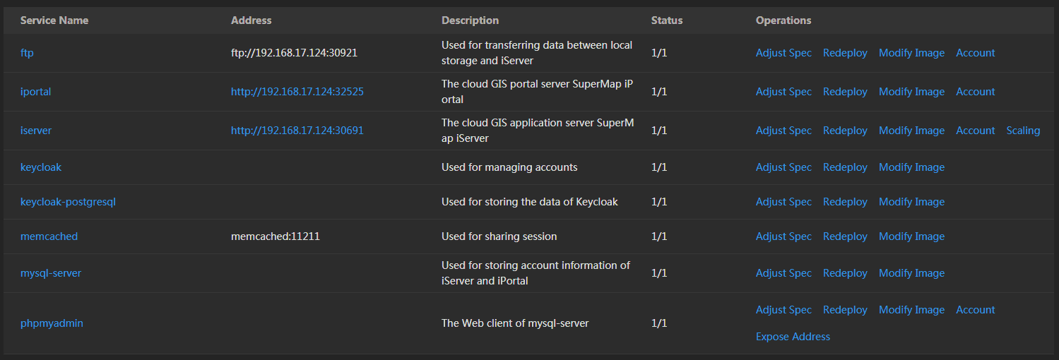 - MySQL-Server: MySQL database, used for storing account information of iServer and iPortal.