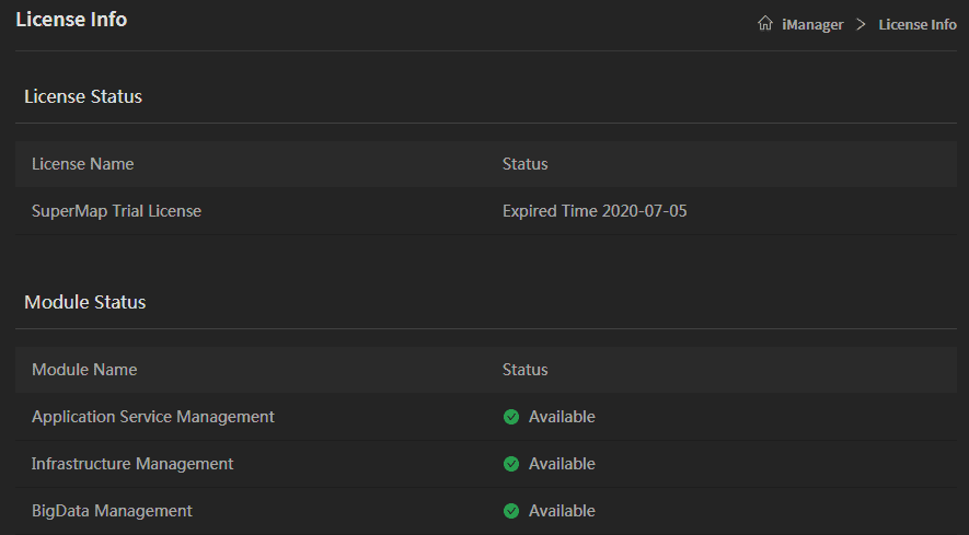 TutorialLicense SuperMap iManager supports to view the license details. The administrator can see the license name, status, and available modules on the page.