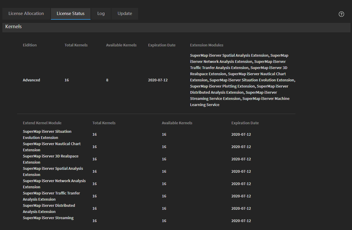 SuperMap iManager 10i(2020) does not support to manual allocation and recovering the license, the service nodes will obtain the license automatically.