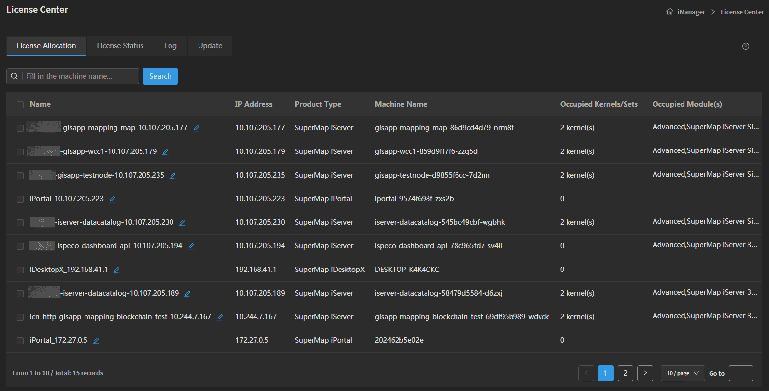 In the License Allocation interface, the administrator can get the information of Name, IP Address, Product Type, Machine Name, Occupied Kernels/Sets, and Occupied Module(s). The name of the node supports to be modified. You can filter the nodes information by the Search function.