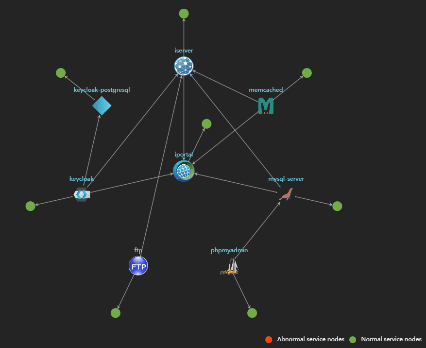 The topological diagram of GIS Site is helpful for understanding the associations between the services. In the diagram, the services of iServer, iSite, Keycloak, FTP, MySQL-server, Memcached, and Phpmyadmin have exclusive icons; circle symbols represent service nodes(if the service extended, you can see a service has multiple circle nodes), the green circle means the service is running good, the red circle means the service is not working. The topological diagram supports to zoom in/out, if you put the mouse on the service, the associated services will be highlighted, the associations between the services will be explained by the arrows and texts.