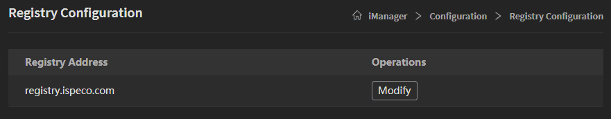 SuperMap iManager provides the abilities of viewing and modifying the configuration of registry. Administrator can get the registry address by clicking Configuration > Registry Confuguration on the left navigation bar of iManager, and modify the address by clicking on Modify.