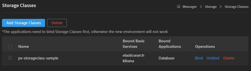 On the StorageClasses page, users can delete existing StorageClasses, and bind/unbind basic services and applications to the specified StorageClass.