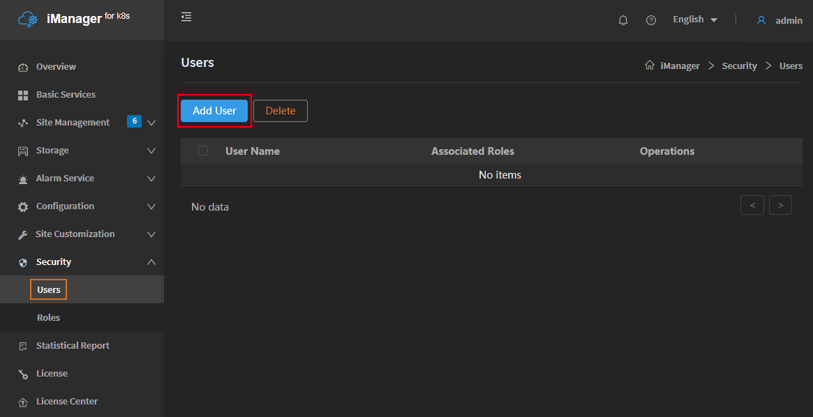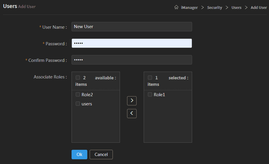 In the Users page, the administrator can create new users, and associate roles to the users.