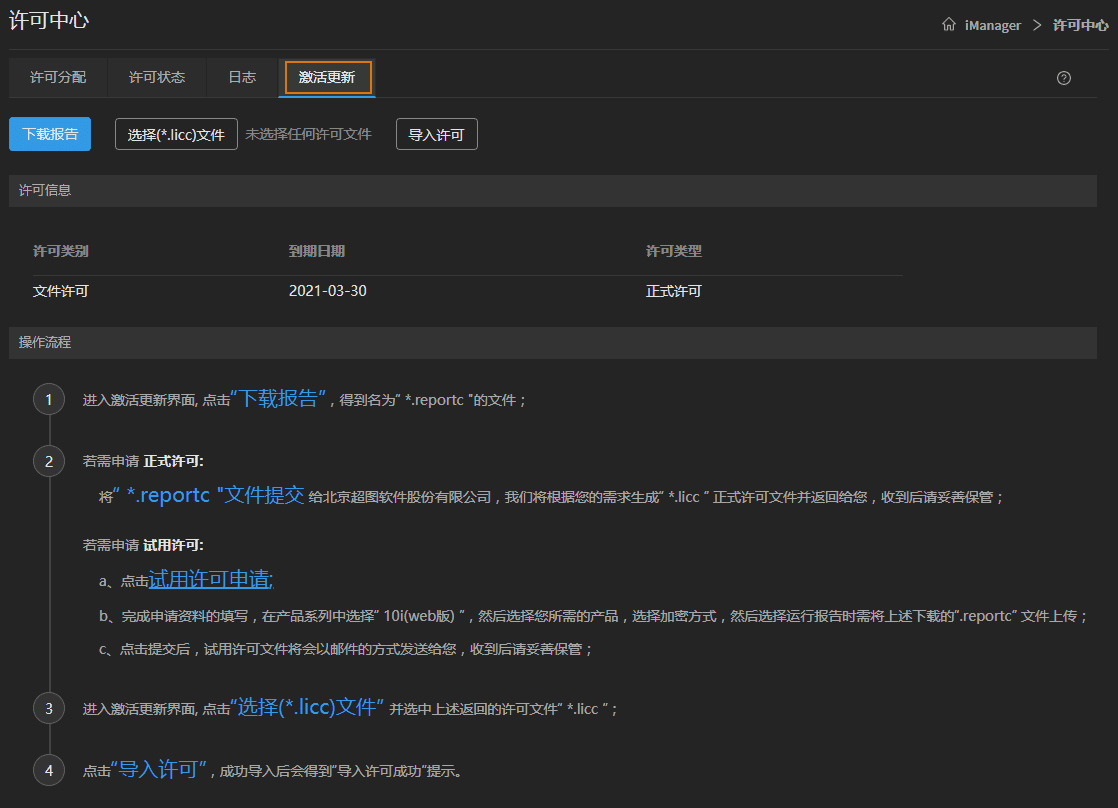 访问iManager 页面,在没有许可的情况下会自动跳转到许可中心(Web版)页面,点击激活更新,参照操作流程导入许可