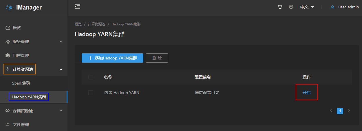 - 打开左侧导航栏计算资源池,点击Hadoop YARN集群;