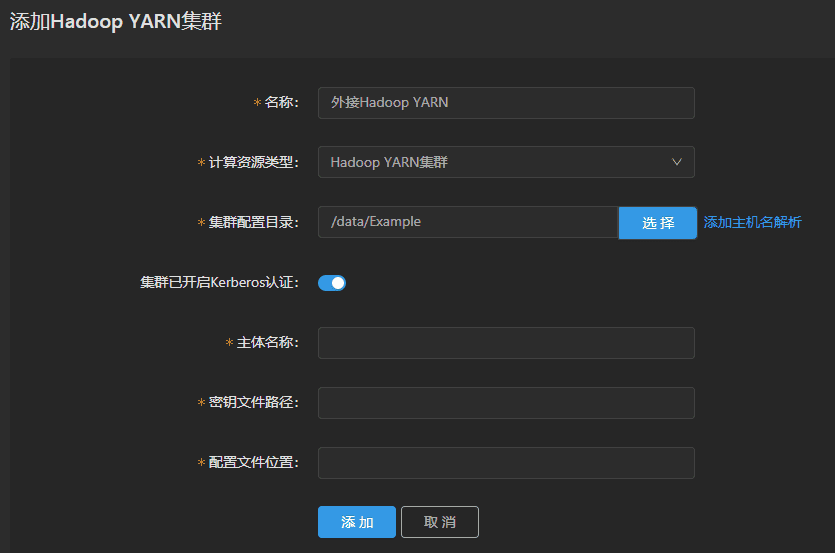 集群开启Kerberos认证:如果开启Kerberos认证,则需填入以下信息: