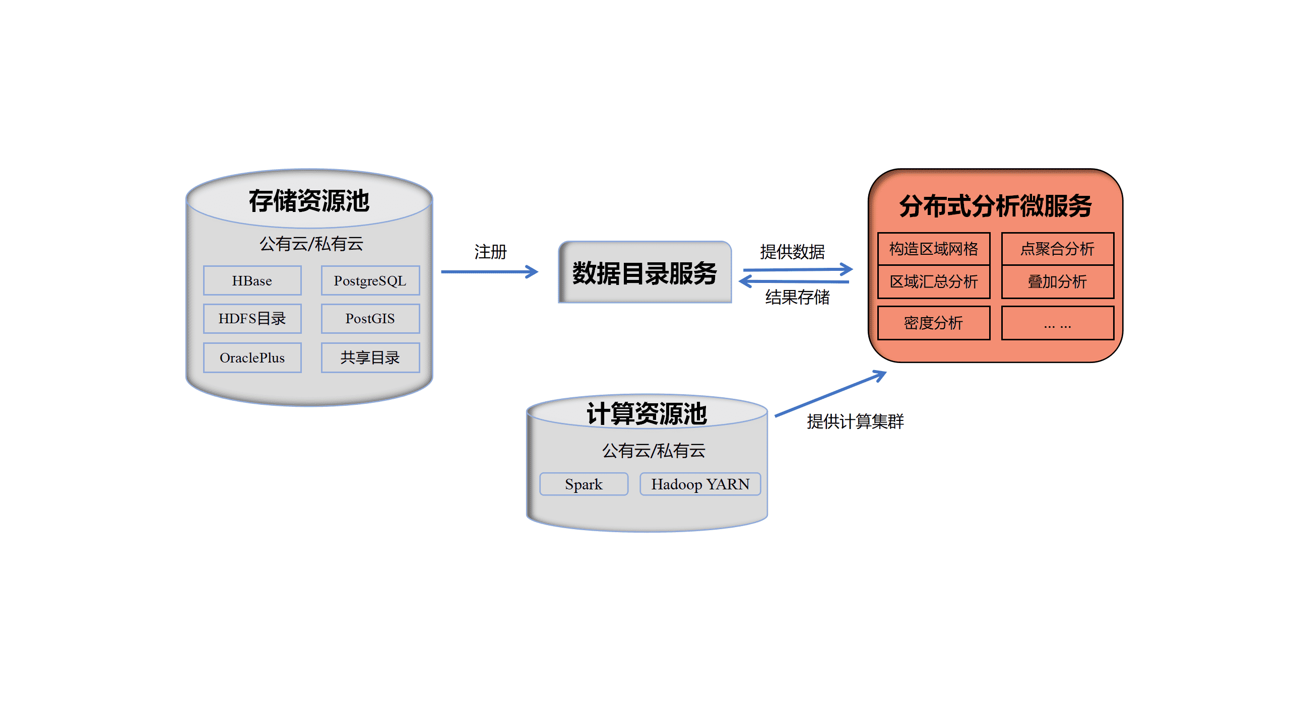 GIS云套件分布式分析服务提供了GIS分布式分析处理的能力。可接入分布式存储的地理数据,包括空间数据库HBase、PostGIS、PostgreSQL中存储的关系型数据集,以及 HDFS中存储的csv数据、index文件数据。分布式分析服务提供强大的空间分析能力,例如大数据的地图出图、分析与管理、分布式动态出图。所有功能提供 REST API,方便开发与扩展。 如下图所示,分布式分析服务需要数据目录服务(请参照GIS云套件->服务管理->数据目录服务)、计算资源池(请参照GIS云套件->计算资源池)、存储资源池(请参照GIS云套件->存储资源池)共同支持。