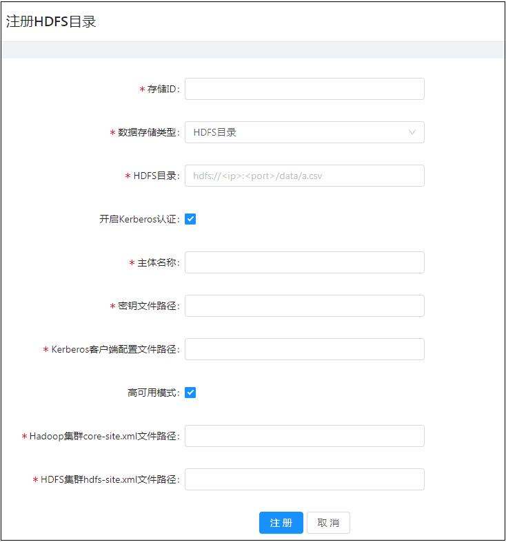 - 如果注册的是HDFS集群为高可用模式,则可以直接填高可用的HDFS地址,如,hdfs://{高可用地址}/data。
