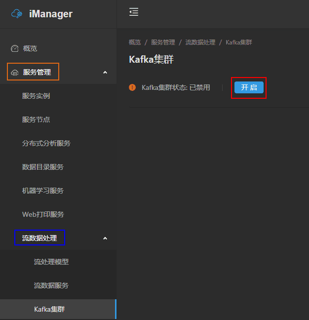 GIS云套件支持对内置Kafka集群进行管理,点击服务管理->流数据处理->Kafka集群->开启可一键开启集群,避免手动搭建;点击禁用可关闭集群,释放系统资源。